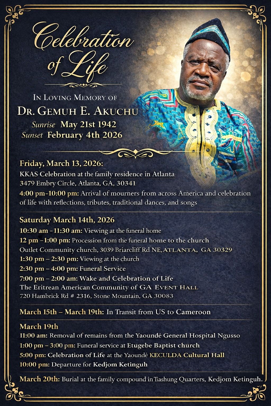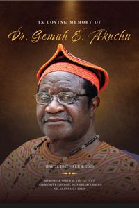 Celebration of Life Services for Dr. Gemuh E. Akuchu, of Atlanta, GA., will be held Saturday, March 14, 2026, 2:30 P.M. at Outlet Community Church, 3039 Briarcliff Rd., Atlanta, GA., with remains placed in repose at 1:30 P.M. Reverend Liz Pearson, Officiating, Eulogist. A family visitation will be held at Eritrean American Community of Georgia Event Hall, Saturday following the services at 7:00 P.M.