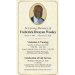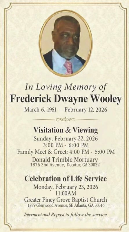 Celebration of Life Services for Mr. Frederick Dwayne Wooley, will be held Monday, February 23, 2026, 11:00 A.M. at The Greater Piney Grove Baptist Church, 1879 Glenwood Avenue, Atlanta, GA., with remains placed in repose at 10:00 A.M. Reverend William E. Flippin, Sr., Senior Pastor, Eulogist. Interment, Kennedy Memorial Gardens, Ellenwood, GA. Public Viewing and Visitation will be held at the mortuary Sunday, 3:00 P.M. until 6:00 P.M.