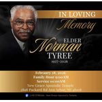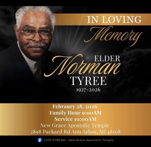 Mr. Norman Tyree of Ann Arbor, Michigan Loving Father, Grandfather, Uncle & Cousin born on January 13,1927 in Eutaw, Alabama made his transition on Friday, February 13,2026 at Glacier Hills in Ann Arbor, Michigan at the age of 99. Visitation will be held on Saturday, February 28,2026 from 9:00 AM to 10:00 AM with the Celebration Of Life at 10:00 AM at New Grace Apostolic Church 2898 Packard St. in Ann Arbor, Michigan 48108. Interment will follow at Washtenong Memorial Park Cemetery in Ann Arbor, Michigan.