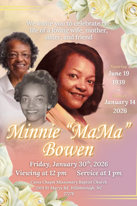 Minnie Helleard Bowen, 86, was born on Monday, June 19, 1939 and passed on Wednesday, January 14, 2026. Funeral Arrangements: Funeral Service: Friday, January 30, 2026 | Visitation: 12:00noon | Funeral: 1:00pm Place…