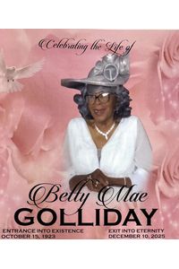 Funeral services for Betty Mae Golliday, 93, of Shaw, Ms will be held Monday December 15, 2025 at 11am at Mt. Galilee MB Church with burial following in Mt. Galilee Cemetery under the direction of Johnson and Scott…
