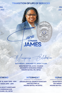 Funeral services for Tara Cynara James, 62, of Mound Bayou, MS will be held Saturday, January 17, 2026 at 11am at Greater Bethel AME Church, Mound Bayou, Ms with burial following in Jerusalem Cemetery, Mound Bayou,Ms…