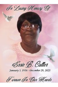 Funeral services for Essie B. Collier, 69, of Mound Bayou,Ms will be held Saturday, January 10, 2026 at 11am at Johnson and Scott Mortuary with burial following in Calvary Cemetery, Renova, Ms under the direction Johnson and Scott Mortuary, Cleveland. She died Monday, December 29, 2025 at Delta Health System- The Medical Center, Greenville, Ms.