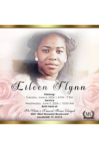 Viewing for Eileen J. Flynn will be held Tuesday, June 4, 2024 from 4:00PM - 7:00PM at McWhite's Funeral Home. 3501 W. Broward Blvd. Lauderhill, FL. 33312