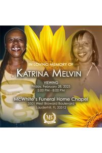 Viewing for Katrina Melvin will be held Friday, February 28, 2025 at 5:00PM - 8:00PM at McWhite's Funeral Home 3501 W. Broward Blvd. Lauderhill, FL. 33312