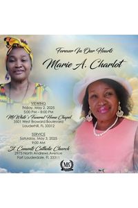 Viewing for Marie Charlot will be held Friday, May 2, 2025 at 5:00PM - 8:00PM at McWhite's Funeral Home. 3501 W. Broward Blvd. Fort Lauderdale, FL. 33312