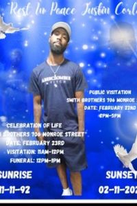 Justin LaMontez Corley-February 11, 2026. Survived by family and friends. Public viewing, Sunday February 22,2026 2-5pm,Smith Funeral home, 706 Monroe Street. Family visitation, Monday February 23,2026 11-12pm with funeral service to follow at Smith Funeral Chapel. Smith Funeral Directors, Inc.(615)726-1476