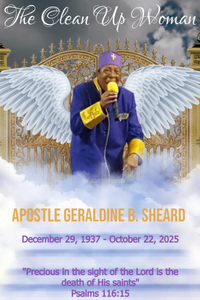 Apostle Geraldine B. Sheard, โThe Clean Up Womanโ, of the Hugh Creek Community of Blountstown, Florida made her heavenly departure on Wednesday, October 22, 2025.
